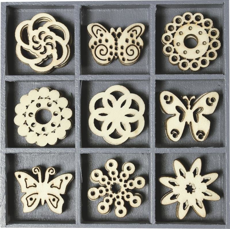 Dřevěné ozdoby vhodné pro dekorační zdobení, výrobu přání, dětskou tvorbu. Baleno v dřevěné krabičce 10,5 x 10,5cm. prečítať celé