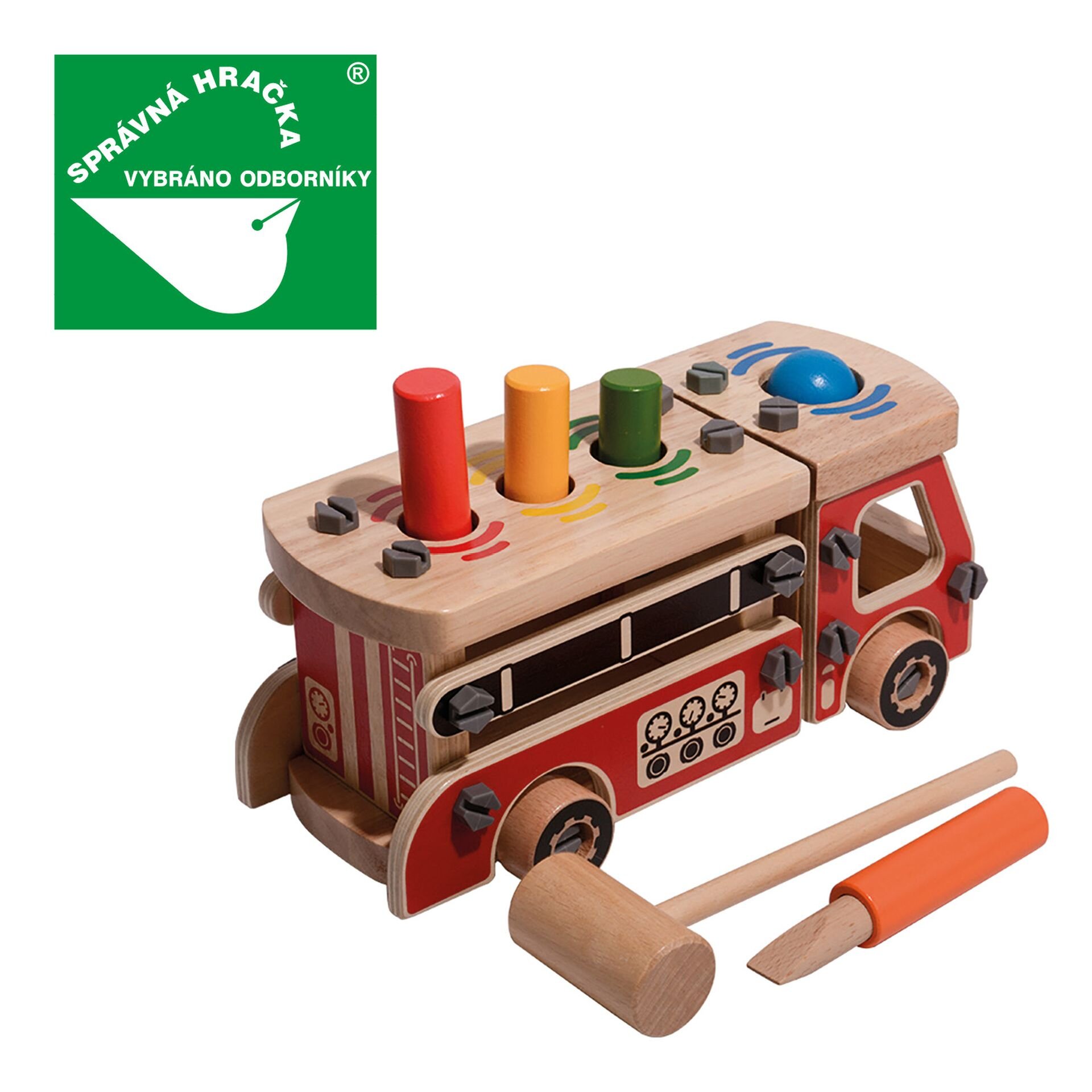 Dřevěná konstrukční sada Hasiči zaujme především chlapce. Sada obsahuje spoustu dřevěných dílů, šroubů a nářadí pro montáž, plus kladívko a 4 zatloukací dřevěné prvky. Po sestavení a sešroubování všech dřevěných dílů získá malý stavitel krásné hasičské auto, která má na střeše korby a návěsu...