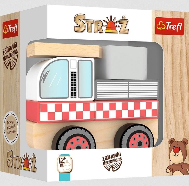 Zabawka Straż z serii Zabawki Drewniane rozwija zdolności motoryczne oraz wzmacnia odruch chwytania. Autko uczy precyzji, pobudza wyobraźnię, a także rozwija koordynację wzrokowo-ruchową. Zabawka posiada ruchome elementy. Wszystkie materiały wykorzystane do stworzenia zabawki posiadają atesty, a także zostały pomalowane nietoksycznymi farbami.