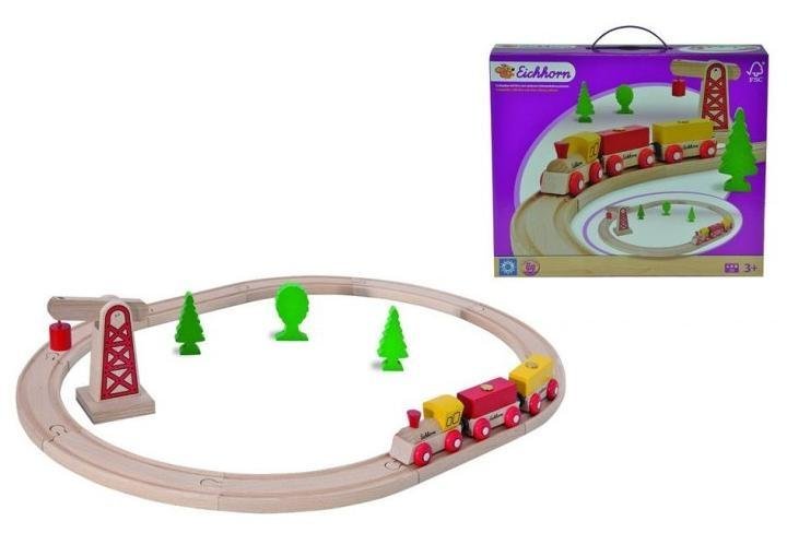 Drewniana kolejka z elementami torów, wagonów, z figurkami i akcesoriami, drewno bukowe. prečítať celé