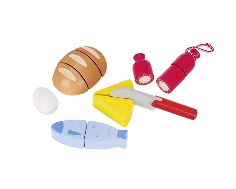 Mmm, jedzonko! Z tymi akcesoriami zjemy pyszny posiłek! Nóż, którym dziecko będzie się posługiwało w bezpieczny sposób, pozwoli opanować jego używanie, ćwicząc motorykę małą. Poza tym jest bochenek chleba, z którego możemy zrobić kanapki z żółtym serem czy kiełbasą. Jajko i ryba mogą być ciekawą przekąską, która może pozytywnie wpłynąć na nawyki żywieniowe malca.