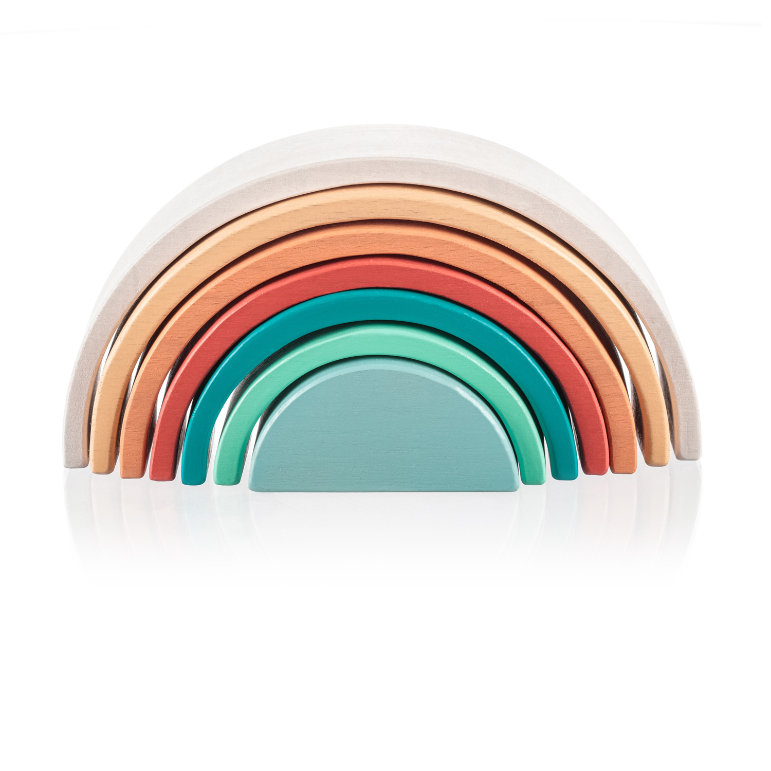 Dřevěná duha v pastelových barvách. Vhodné pro děti od 18 měsíců.Učení by měla být zábava. Roztomilá hračka ve tvaru a barvách duhy je skvělým pomocníkem pro motorický rozvoj, představivost a kreativitu dětí. Ze skládačky se dají vytvořit nejrůznější tvary. Vytvořte tunely, domečky pro zvířátka...