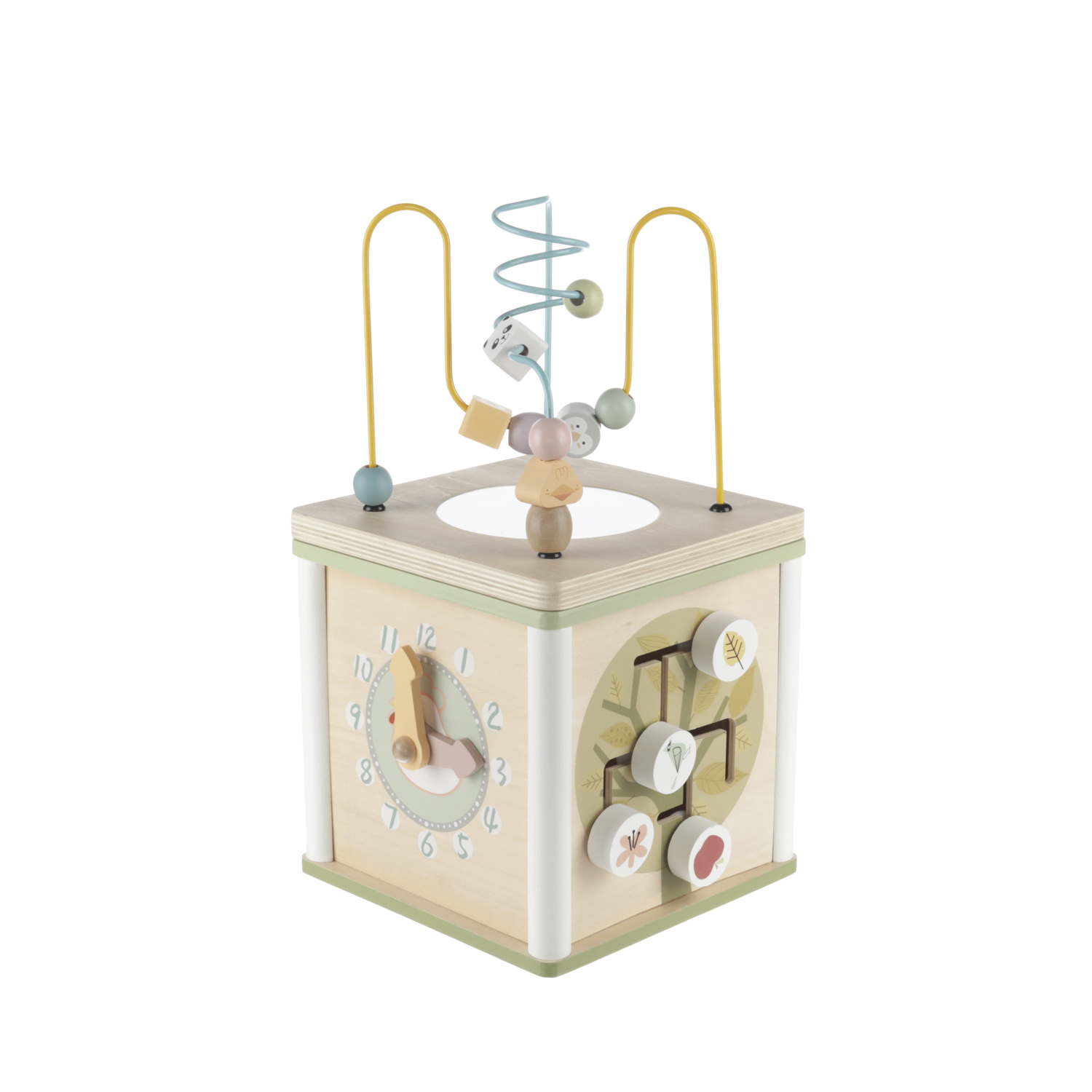 Pro zvídavé dětiRoztomilá kostka, která v sobě ukrývá aktivity skládačku. Po stranách kostky jsou otočné dřevěné tvary s různými motivy. Hračka rozvíjí koordinaci, prostorovou představivost a dovednost rukou. Posouvání kuliček a tvarů také může děti naučit prvnímu počítání a rozpoznávání barev....