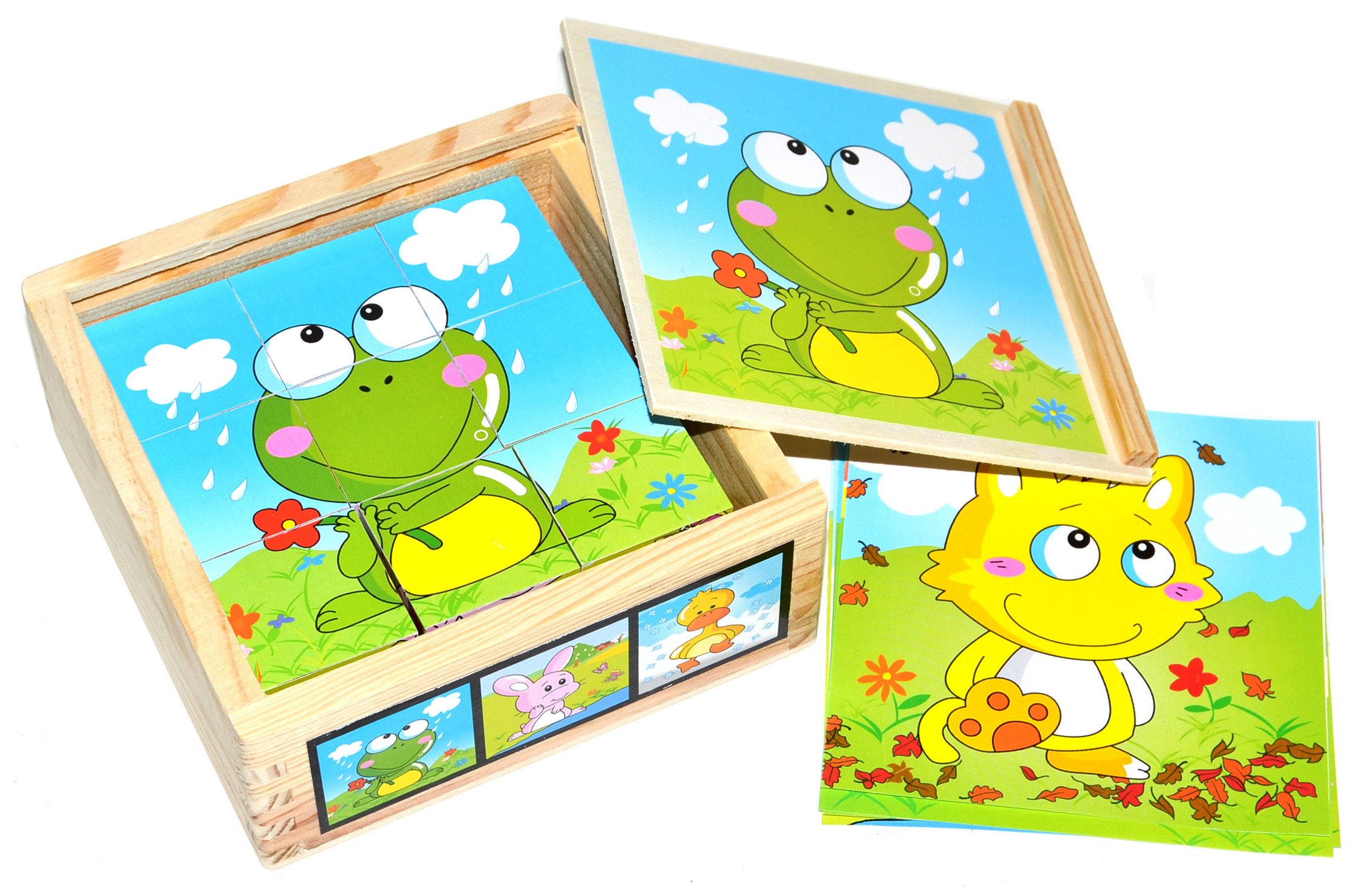 Obrázkové kostky v dřevěné krabičce se zasunovacím víkem. Krabička obsahuje 9 ks dřevěných kostek, z nichž je možné sestavit 6 různých obrázků, postavit třeba komín, hrad nebo ohradu pro zvířátka. Rozvíjí logické myšlení, prostorové vnímání a předsta prečítať celé