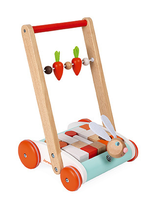 Dřevěná hračka pro děti ve věku 1-4 let. Tento úžasný vozík je ideální pro děti, které se dosud nepodařilo procházet: roztomilá hlava zajíčka je připojena k jaru a mrkev je připojena k pultu. Vaše dítě může hrát s 19 dřevěnými kostkami. Kompletní produkt, který vyvíjí hrubé motorické dovednosti (chůzi s bezpečným systémem převrácení) a jemné motorické dovednosti (manipulace s kostkami). Dodává se s odnímatelným brzdovým systémem. Vhodné pro děti od 1 roku.