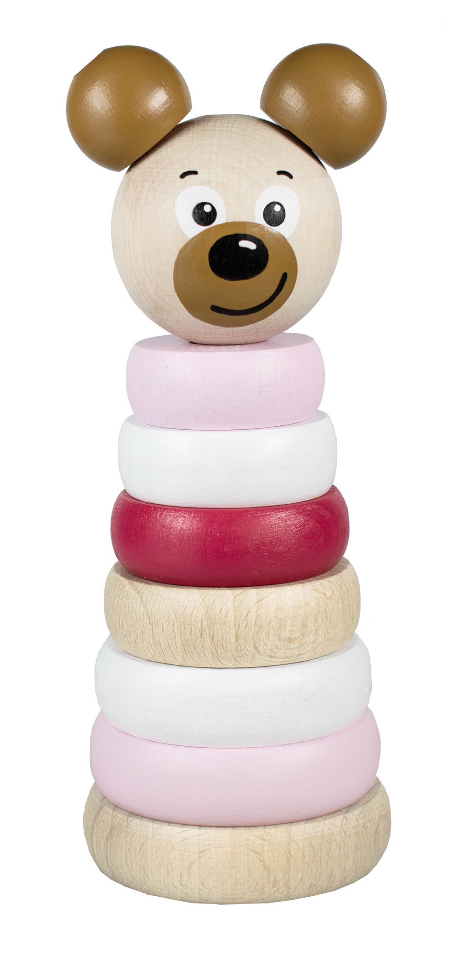 Dřevěná skládací pyramida s motivem méďi, rozvijí představivost, logické myšlení a motorické schopnosti dítěte. Výrobek splňuje požadavky EU na bezpečnost hraček a je vhodný pro děti od 1 roku. Rozměry výrobku jsou 140 x 55 mm. Výrobek je balen v ekologické papírové krabici.