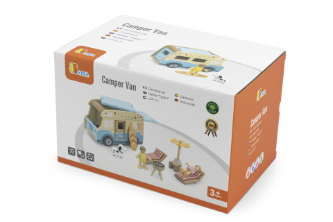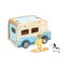 Dřevěné obytné auto s příslušenstvím. Balení obsahuje auto, 2 lehátka, 2 postavičky, pejska, gril, stoleček se slunečníkem a surfovací prkno. Rozměry auta 19x11,8x12,5 cm. Rozměry balení cca 23,5x15x15,5 cm. Věk 3+ prečítať celé