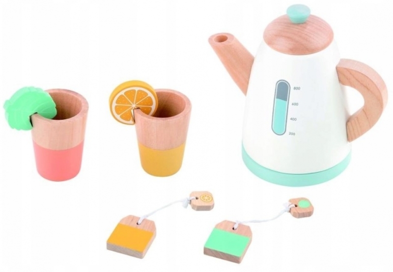 strong>Dřevěná hračka - čajový set.Tato fantastická hračka je ideální dárek pro Vaše dítě.Sada ze dřeva v pastelových barvách je nadčasová hračka, která spojuje vzdělávání a zábavu a přitom krásně vypadá.Sada obsahuje:- konvice s víkem na stojanu,- 2 šálky,- 2 čajové sáčky, - 1 list máty.- 1...