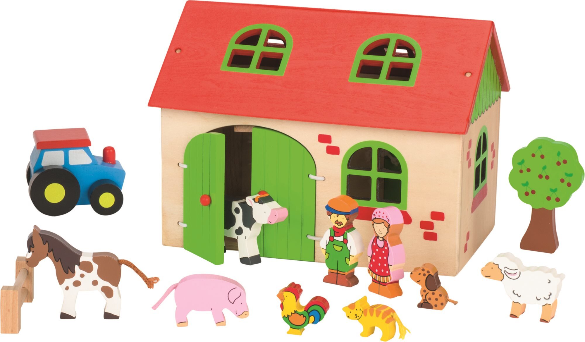 Dřevěná farma od značky GOKI Tolik práce je třeba udělat na malé farmě. Nakrmit dobytek, zorat pole, sklidit ovoce ze stromů.... Set obsahuje: Dřevěnou farmu s otevíracími vraty a střechou- rozměry 19,5 x 14,5 x 13,5 cm, dřevěné figurky (celkem 13 ks) Hračka podporuje jemnou motoriku a...
