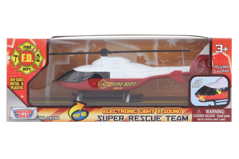 Kovová hasičská helikoptéra na baterie. Po zmáčknutí tlačítka helikoptéra svítí a vydává zvuky. Napájení na 3 LR44 baterie (jsou součástí). Rozměry helikoptéry cca 18,5 x 5 x 4 cm. Věk 3+ prečítať celé
