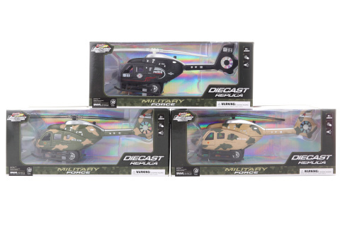 Kovová helikoptéra na baterie. Helikoptéra svítí a vydává zvuky. Napájení na 3 AG13 baterie (jsou součástí). Rozměry helikoptéry cca 21 x 7,5 cm. Rozměry balení cca 27 x 11,5 x 7 cm. Věk 3+ prečítať celé
