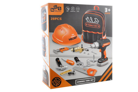 Sada nářadí v látkovém batohu. Balení obsahuje batoh, helmu, pilku, šroubovák, šupléru, kladívko, vrtačku na baterie (napájení na 2xAA baterie, které nejsou součástí balení) a menší doplňky jako např. šroubky - celkem 28 ks. Materiál plast. Baleno v krabici. Rozměry balení cca 26x30x11 cm. Věk 3+