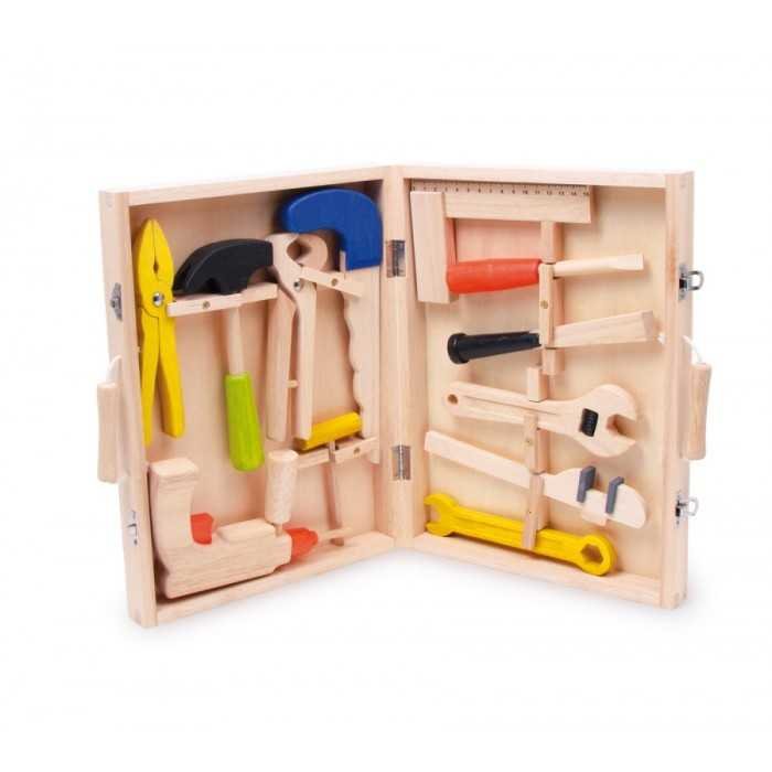 V tomto vysoce kvalitním dřevěném kufříku najdete 12 dřevěných nástrojů. Nástroje jsou na svém místě zajištěny otočnými pojistkami, vrtačka suchým zipsem. Držadla kufříku jsou vyrobena z textilní šňůry a dřeva pro pohodlné uchopení. Kufřík je skvělou pracovní hračkou pro malé řemeslníky!Německá...
