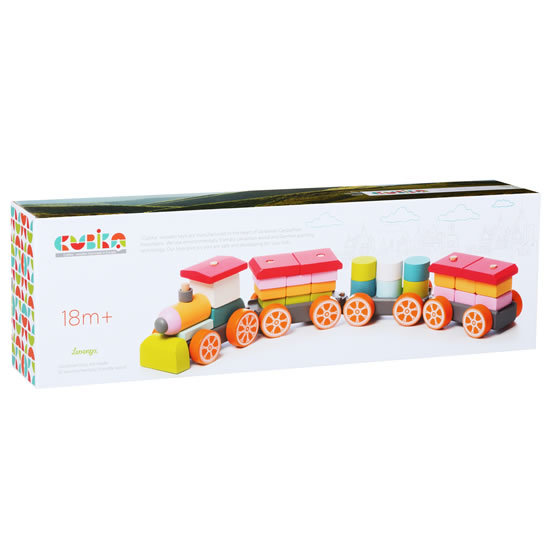 CUBIKA je nová značka dřevěných hraček vyrobených pouze z ekologicky pěstovaného dřeva s velmi precizním opracováním a líbivým designem. Vláček se třemi vagonky je dřevěná skládačka s 35 barevnými díly. Jednotlivé kostičky je třeba poskládat tak, aby mohl vláček vyrazit s plným nákladem na cestu....