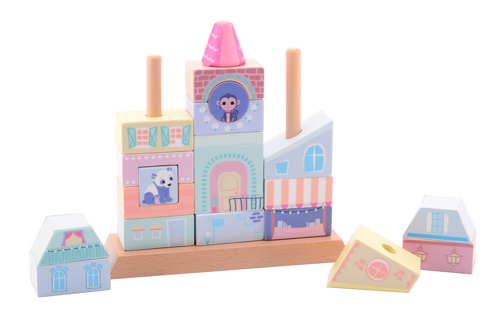 Dřevěné kostky se stojánkem. Sada obsahuje kostky na stavbu domečku s dveřmi, okénky atp. Vyrobeno z kvalitního bukového dřeva, barveno nezávadnými barvami, testováno v EU. prečítať celé