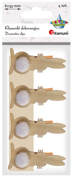 Klamerki drewniane z dekorem, kolor: naturalne, wymiary klamerki: 7 x 35 mm, wymiary dekoru - króliczki tyłem drewniane: 23 x 48 mm, z pomponem białym. 4 sztuki. prečítať celé