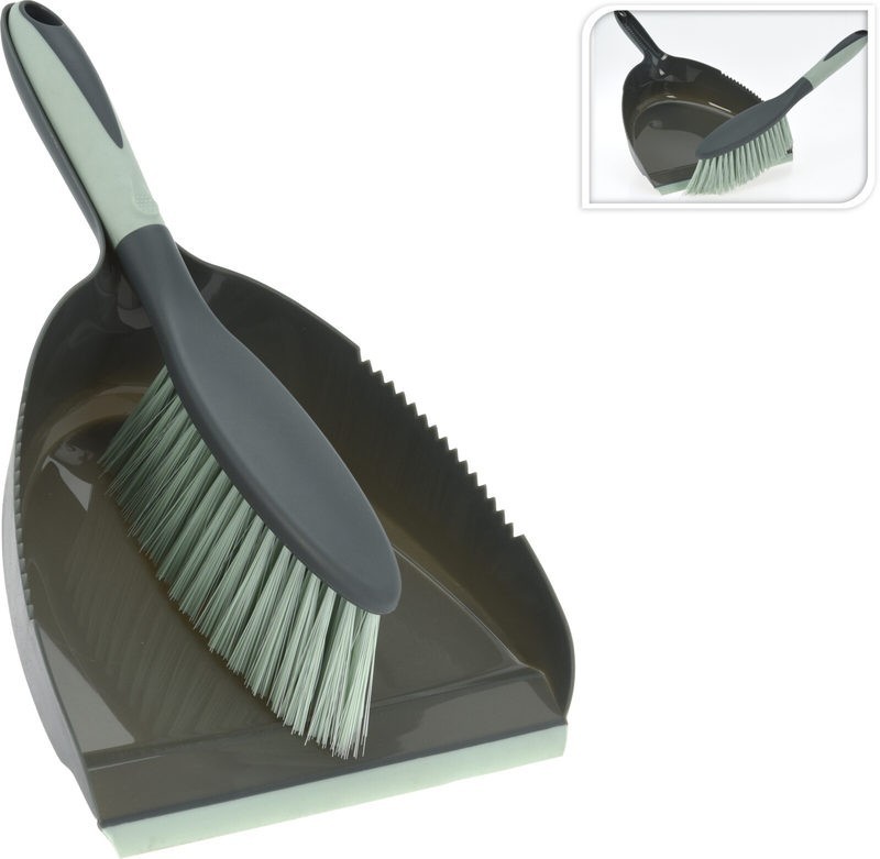 DUSTPAN AND BROOM, PP WITH TPE, SIZE 338X223XH80MM, WEIGHT 205 GRAM, BULK PACKED, IN TWO TONE NATURALS COLOR COMBINATION, PP PART IN GREY-445C, TPE PART IN GREEN-5585C. EACH WITH OUR DESIGN HANGTAG/ 335X220X90MM, Hangtag: 1 X Dustpan,1 X Broom / CFT 0,73,(42.001/40ft HQ)