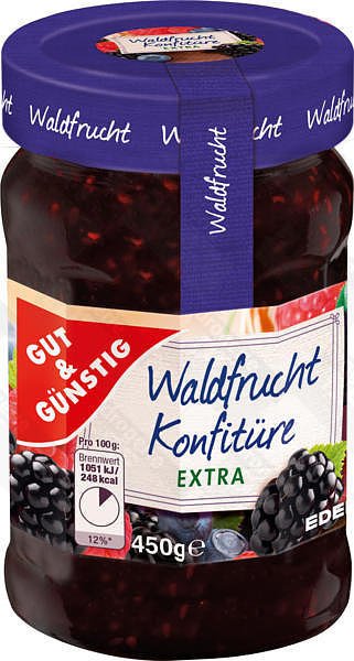 Kvalitní německý džem s podílem ovoce 50% - velké balení 450gr Lesní plody Skvělý německý džem s vysokým obsahem kvalitního ovoce, který stojí rozhodně za ochutnání. Výborný je na čerstvý chléb ale i k pečení na promazání perníčku či cukroví. Džem má v sobě kousky ovoce a příjemně želíruje....