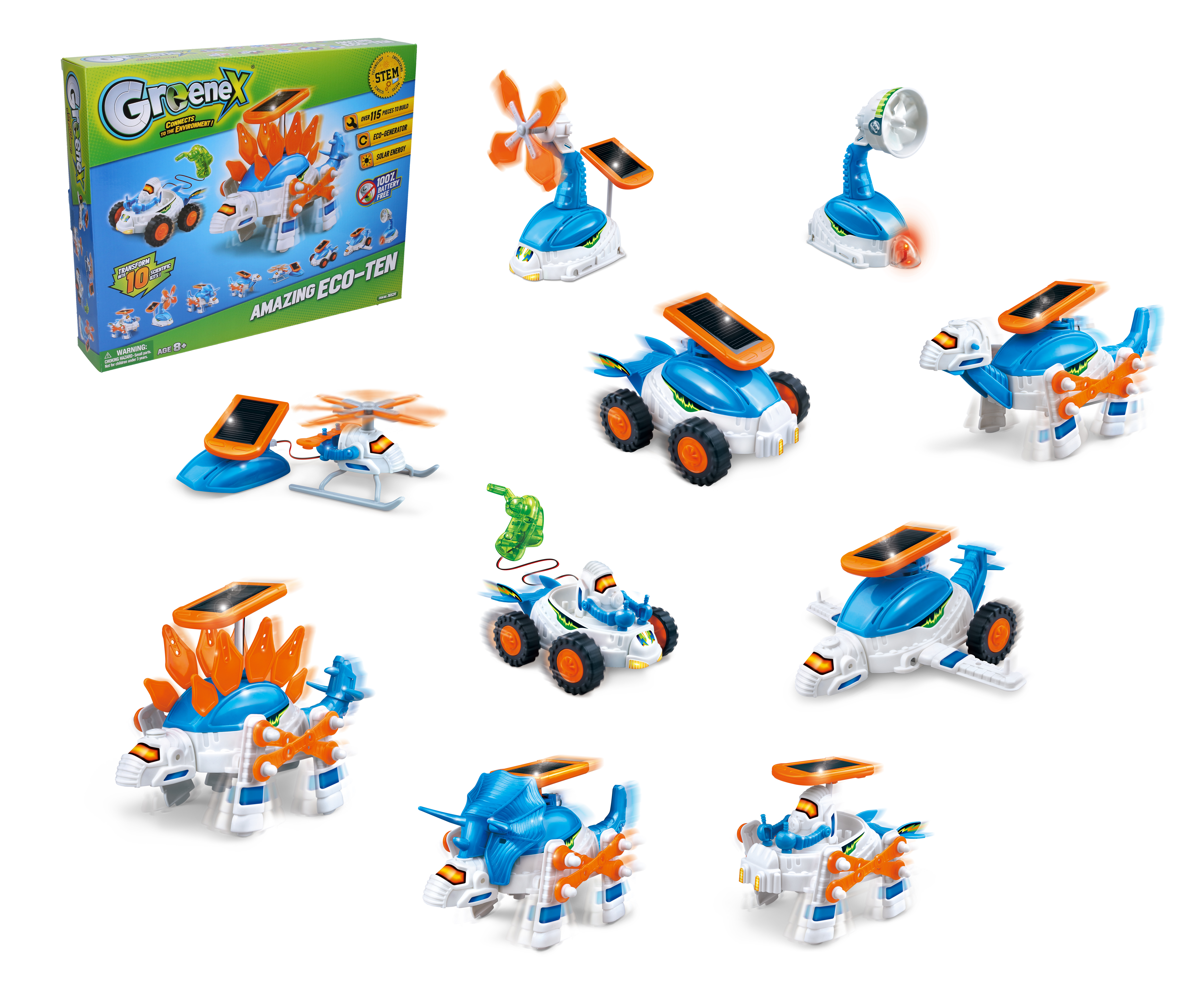 Věda set obnovitelná energie 115 dílů. Je možné složit 10 zařízení - vesmírný solární průzkumník, solární robotické chodítko, vesmírná solární turbína, solární vrtulník, solární GoGo vozítko, solární Energy Racer, solární triceratops, solární stegosaurus, solární apatosaurus, LED žárovička napájená větrnou turbínou.