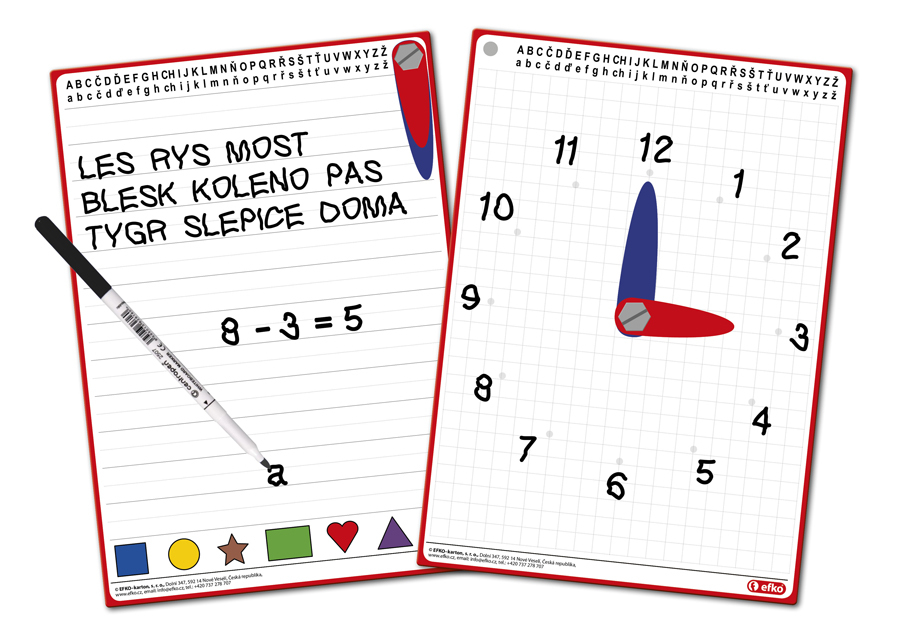 Praktická stíratelná tabulka s českou abecedou a možností sestavení edukativních dětských hodin. Obsahuje: tabulku, popisovač Centropen, hadřík, hodinové ručičky, šroub, matku a podložku. Vyrobeno v České republice. prečítať celé
