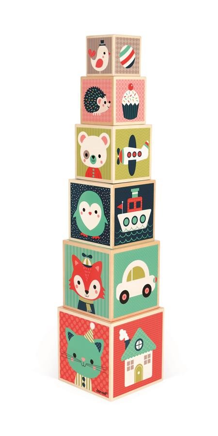 Skládací dřevěná pyramida Zvířata Čísla Věci Janod čtvercová 6 dílů od 1 roku