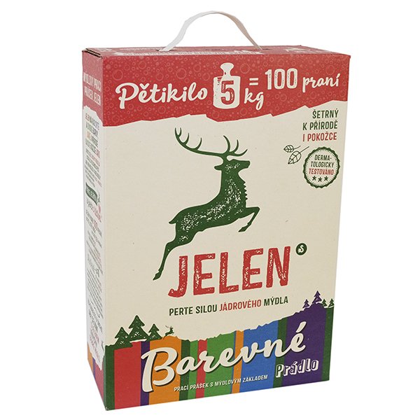 JELEN mýdlový prací prášek na barevné prádlo - 5Kg Jelen má rád syté a divoké barvy, jaké v přírodě uvidíte každé jaro. Proto se o barvy prádla stará s pozornou péčí, aby nevybledly a neuvadly. S Jelenem tak můžete prát v ruce i v pračce. Dbejte přitom na pokyny výrobců prádla a praček.Věřte...