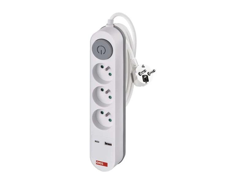 Prodlužovací kabel 2 m / 3 zásuvky / s vypínačem / bílý / 1×USB-A + 1×USB-C / 1,5 mm2.