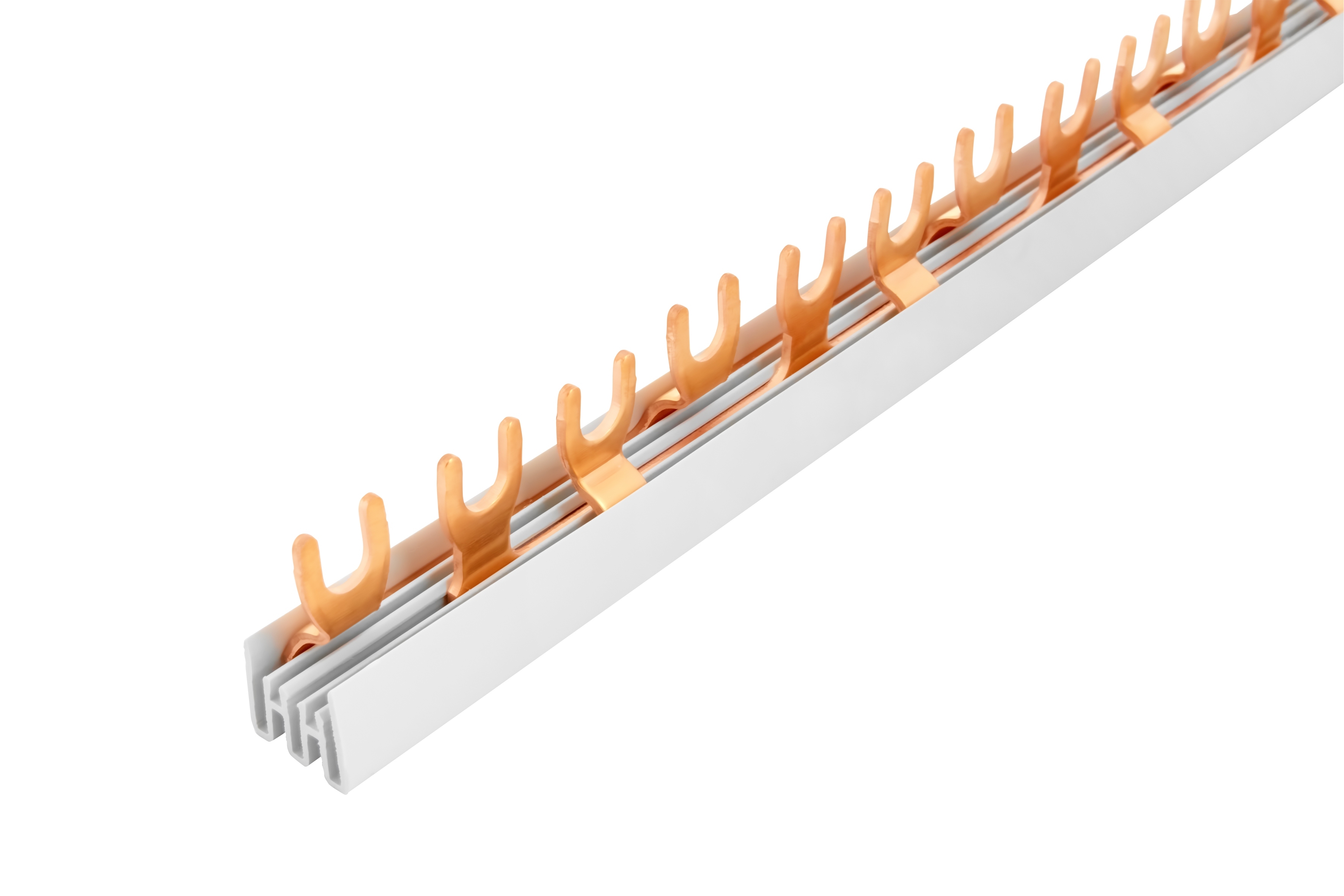 Prop. lišta G-3L-1000/10C SO, vidlička, 3pól., 63A, rozteč 17,8mm, 10mm2, 1m, přip. míst = 57, pro šroub M5-M6, C = vedená středem, koncovka EK-D-3/10.Propojovací fázové lišty umožňují propojení modulových přístrojů (např. jističů, chráničů, modulových vypínačů apod.) jednoduchým a profesionálním...
