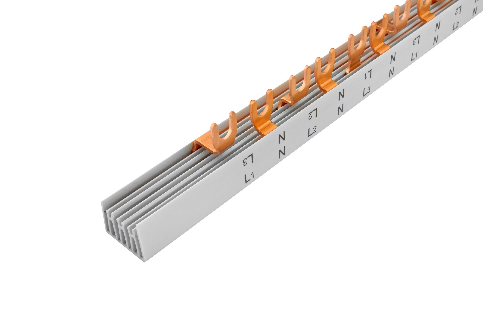 Prop. lišta G-L1+N-L2+N-L3+N-1000/16 P, vidlička, 4pól., 80A, rozteč 17,8mm, 16mm2, 1m, přip. míst = 54, pro šroub M5-M6, koncovka EK-C-4/16.Propojovací fázové lišty umožňují propojení modulových přístrojů (např. jističů, chráničů, modulových vypínačů apod.) jednoduchým a profesionálním způsobem....