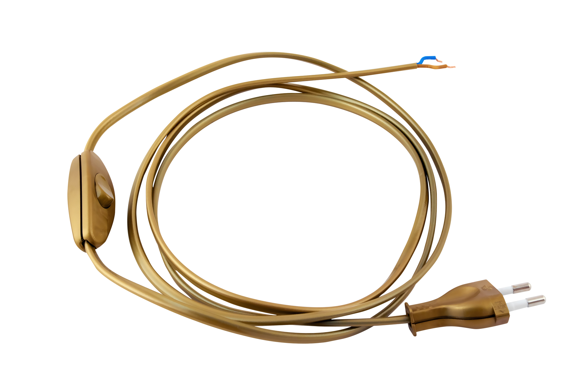 Plastový vypínač s pripojeným 2-metrovým flexibilným káblom typu LFM (2x0,75) je ideálny na spínanie interiérových svietidiel. Vďaka jeho jednopólovému prevedeniu a elektrickému zaťaženiu 2,5 A pri napätí 250 V je vhodný pre bežné domáce použitie. Zlatá farba dodáva výrobku luxusný a nadčasový vzhľad, ktorý sa hodí do rôznych typov interiérov.