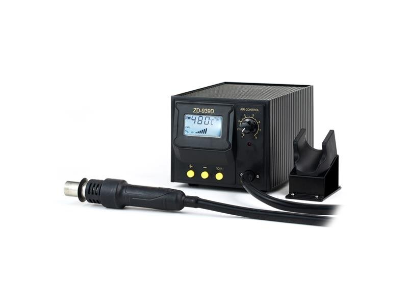 Stolní servisní stanice ZD-939D s displejem má teplotní rozsah 160°C - 480°C. Díky tomu se skvěle hodí na odpájení citlivých obvodů SMD jako QFP, SOP, PLCC, SOJ, BGA a pod. Chrání obvody před poškozením statickou elektřinou a probíjením elektrického proudu. Uplatní se ale i v řadě dalších oblastí použití, u nichž je důležitý koncentrovaný tok horkého vzduchu, např. při čištění 3D tiskáren, při nasazování za tepla, ohřívání materiálů při údržbě nebo montáži. Teplotu lze nastavit na LCD displeji, rychlé zahřátí na provozní teplotu. Množství vzduchu je možné regulovat plynule regulací mebránového čerpadla a pomocí čtyř různých hrotů, které jsou součástí dodávky. Další hroty-nástavce podle tvaru SMD součástky je možné dokoupit. Rukojeť je vybavena protiskluzovou gumou, která nabízí větší pohodlí a usnadňuje manipulaci. Rukojeť horkovzdušné pistole má zabudovaný senzor. Jakmile ji zvednete, okamžitě přejde do pracovního režimu, a jakmile ji vrátíte do držáku, přejde do pohotovostního režimu. Funkce automatického pohotovostního režimu výrazně šetří energii.