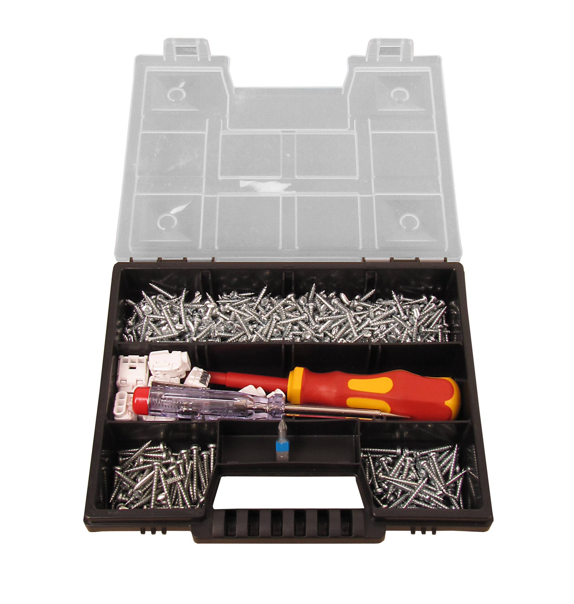 Všetko je prehľadne uložené v kompaktnej plastovej krabičke, ktorá chráni obsah a uľahčuje manipuláciu a skladovanie na pracovisku. Vďaka starostlivému výberu rozmerov vrutov môžete bezpečne upevniť až 250 prístrojov ako vypínače, prepínače či zásuvky do plastových elektroinštalačných krabíc UK a KU 68. Tento základný stavebný materiál elektrošpecialistu vám umožní pracovať rýchlo a s istotou.