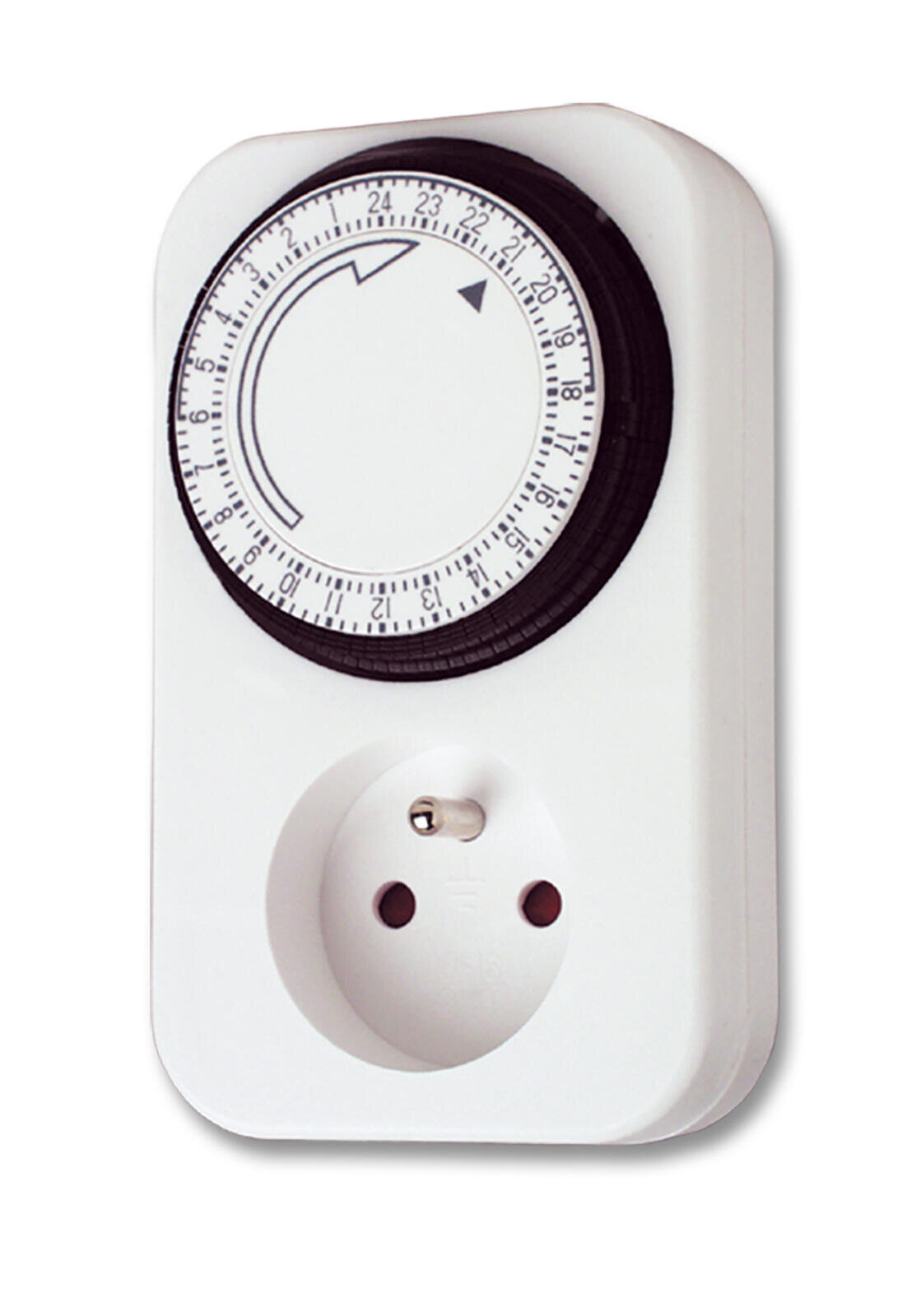 Zásuvka mechanická spínací 24 hod. / 15 min, P20.napětí / proud: ~250 V / 16 A max.časovač (min / max): 15 min / 24 hodpočet zásuvek: 1dětské clonky: anokrytí: IP20certifikace: CE, ROHsmateriál: plastbarva: bíláMechanický časový spínač bílé barvy, který lze nastavit v rozmezí 15 minut až 24...