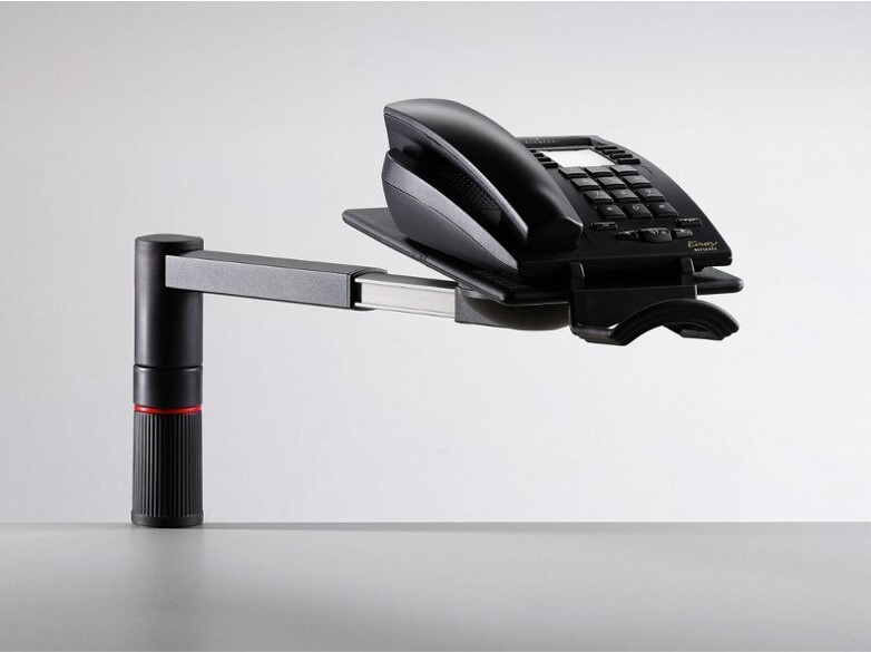 Otočný držák telefonu s teleskopickým otočným ramenem a nosnou deskou, nakloněnou k uživateli a vysunutelnou o 140 mm. Vhodný do kanceláře pro vytvoření profesionálního pracoviště na minimálním prostoru. Vnitřní vedení kabelů v nosném rameni. Upevnění ke stolu univerzální svorkou, která je vhodná pro většinu stolů. Jednoduché a rychlé připevnění bez použití nářadí. Lze namontovat podélně i příčně.