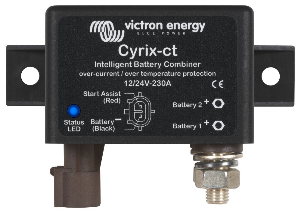 Victron Cyrix-ct 12/24V-230APropojovač baterií Cyrix je mikroprocesorem řízené výkonové relé, které automaticky propojí baterie paralelně, když jedna z nich dosáhla přednastaveného napětí (indikuje, že se baterie nabíjí) a odpojí baterie, když napětí poklesne pod úroveň udržovacího (float) napětí...