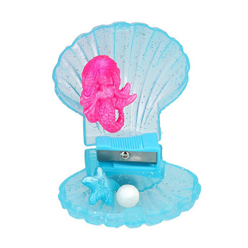 Krásné plastové ořezávátko ve tvaru mušle s gumou ve tvaru mořské panny, perly a hvězdice oblíbené značky Fantasy Model.Zavřená mušle brání vysypání zbytků tuhy z ořezávátka a zabraňuje tak znečištění penálu či aktovky. Praktická pomůcka pro malé školačky.Vhodné pro děti od 3 let.