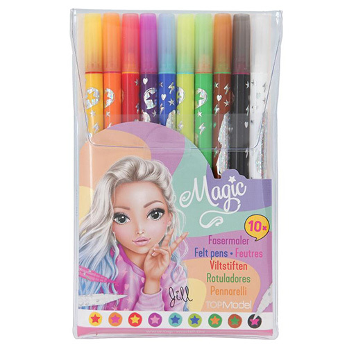 Skvělý set fixů značky Top Model. Devět oboustranných barevných fixů plus jeden magický. Maluj přes své kresby pomocí kouzelného fixu a barvy se změní. Top Model Magic pens mohou být použitý různými způsoby. Na jedné straně má fix tlustší špičku pro rychlejší vybarvování a na druhý straně jemnou špičku pro přesné čáry.Tyto kouzelné fixy musí mít každá modelka.Vhodné pro děti od 3 let.