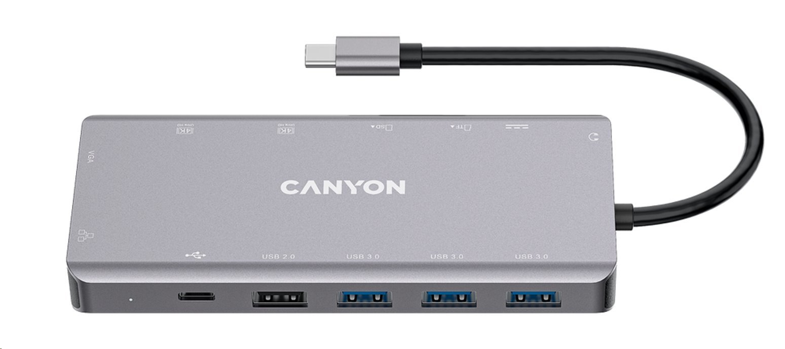 CANYON replikátor portů DS-12 13v1, 1xUSB-C PD 100W, 2xHDMI (4K), VGA, 4xUSB-A, RJ45 Gb, 3.5mm jack, SD/micro čtečka