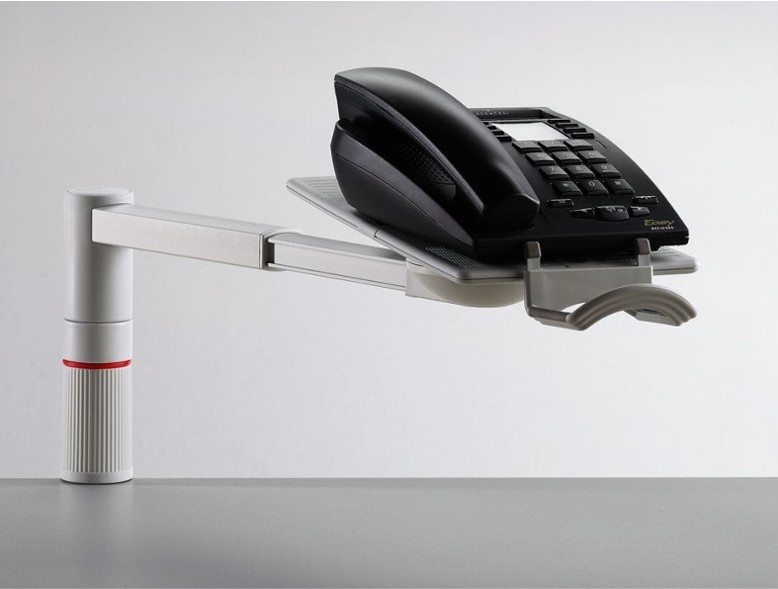 Otočný držák telefonu s teleskopickým otočným ramenem a nosnou deskou, nakloněnou k uživateli a vysunutelnou o 140 mm. Vhodný do kanceláře pro vytvoření profesionálního pracoviště na minimálním prostoru. Vnitřní vedení kabelů v nosném rameni. Upevnění ke stolu univerzální svorkou, která je vhodná pro většinu stolů. Jednoduché a rychlé připevnění bez použití nářadí. Lze namontovat podélně i příčně.