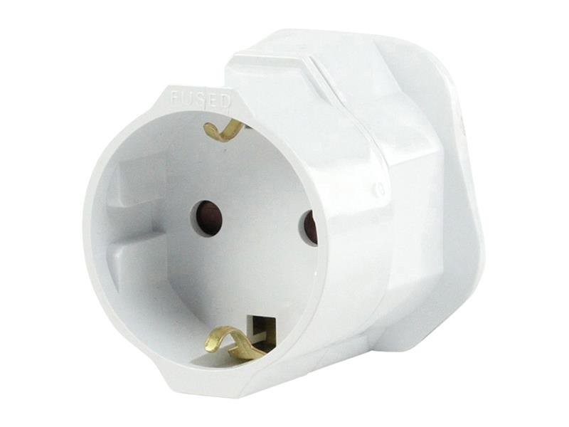 Cestovní adaptér pro cestování do zemí, používající UK standard zásuvek (Anglie, země společenství Commonwealth), 3-kolíkový. Pomocí tohoto adaptéru snadno připojíte zařízení s EU koncovkou k elektrické síti se zásuvkou UK.