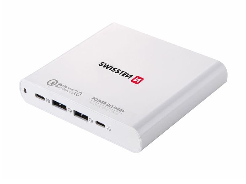 Adaptér síťový SWISSTEN 87W PD3.0 & QC3.0 Síťový adaptér s výkonem 87W pro dobíjení Notebooků a MacBooků. Adaptér je vybavena výstupy 2XUSB-C s technologií rychlého nabíjení POWER DELIVERY pro zařízení s IOS a 2xUSB s rychlým nabíjením Qualcomm pro zařízení s OS Android...