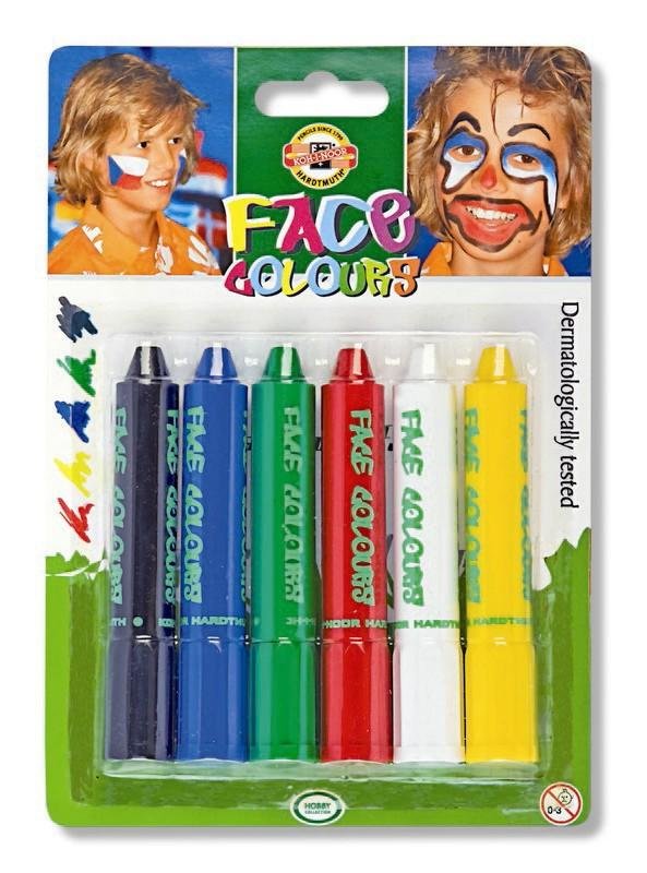 Farby na tvár Koh-i-noor v praktickom balení po šiestich kusoch ponúkajú pestrú škálu základných farieb: bielu, žltú, červenú, zelenú, modrú a čiernu. Ich využitie je naozaj všestranné - jednoducho si nimi nalíčite tvár pri rôznych oslavách, športových alebo tematických akciách či karnevaloch.