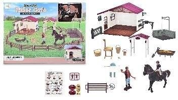 W zestawie: kawiarnia, stanowisko z myjką dla konia, 2 figurki człowieka, figurka konia, 14 x płotek, wiata, akcesoria: koryto, szpadel, stojak na siodło, 2 wiaderka, kosz piknikowy, kask, naklejki, 2 odznaki, szczotka, instrukcja, Funkcje: ściany kawiarni można zamykać i otwierać, ruchome...