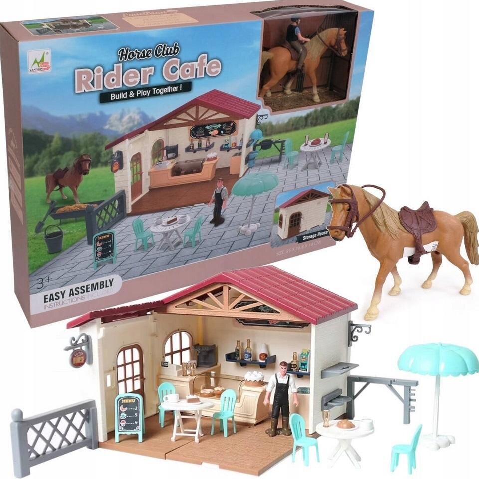 Duża zamykana kawiarnia W zestawie pełne wyposażenie kawiarni takie jak stoliki, krzesełka, zastawa czy parasol na zewnątrz Figurka pracownika kawiarni Figurka konia Ruchome elementy Żywa kolorystyka zachęcająca do zabawy Elementy przedstawiają różne aspekty życia na farmie...