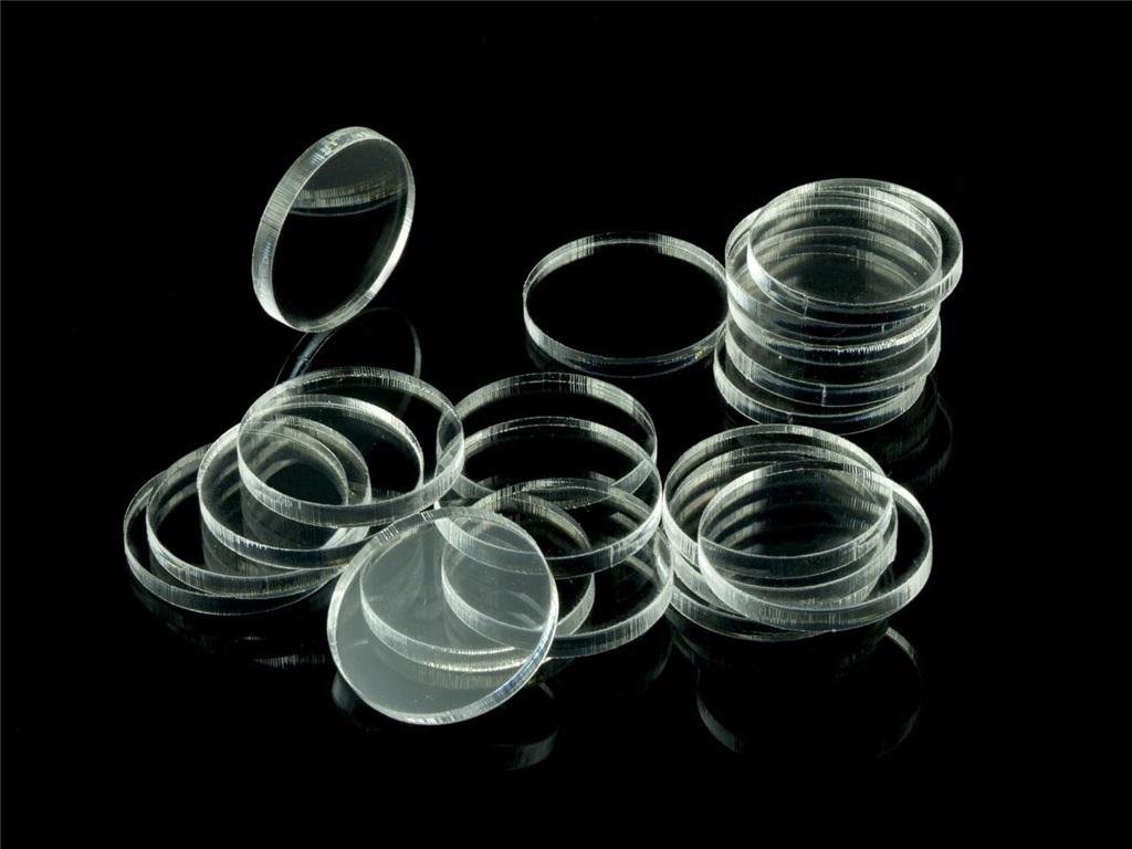 Akrylowe podstawki pod figurki w kształcie koła, transparentne, o średnicy 25 mm i grubości 3 mm, 20 sztuk. Podstawki są zabezpieczone obustronnie folią.