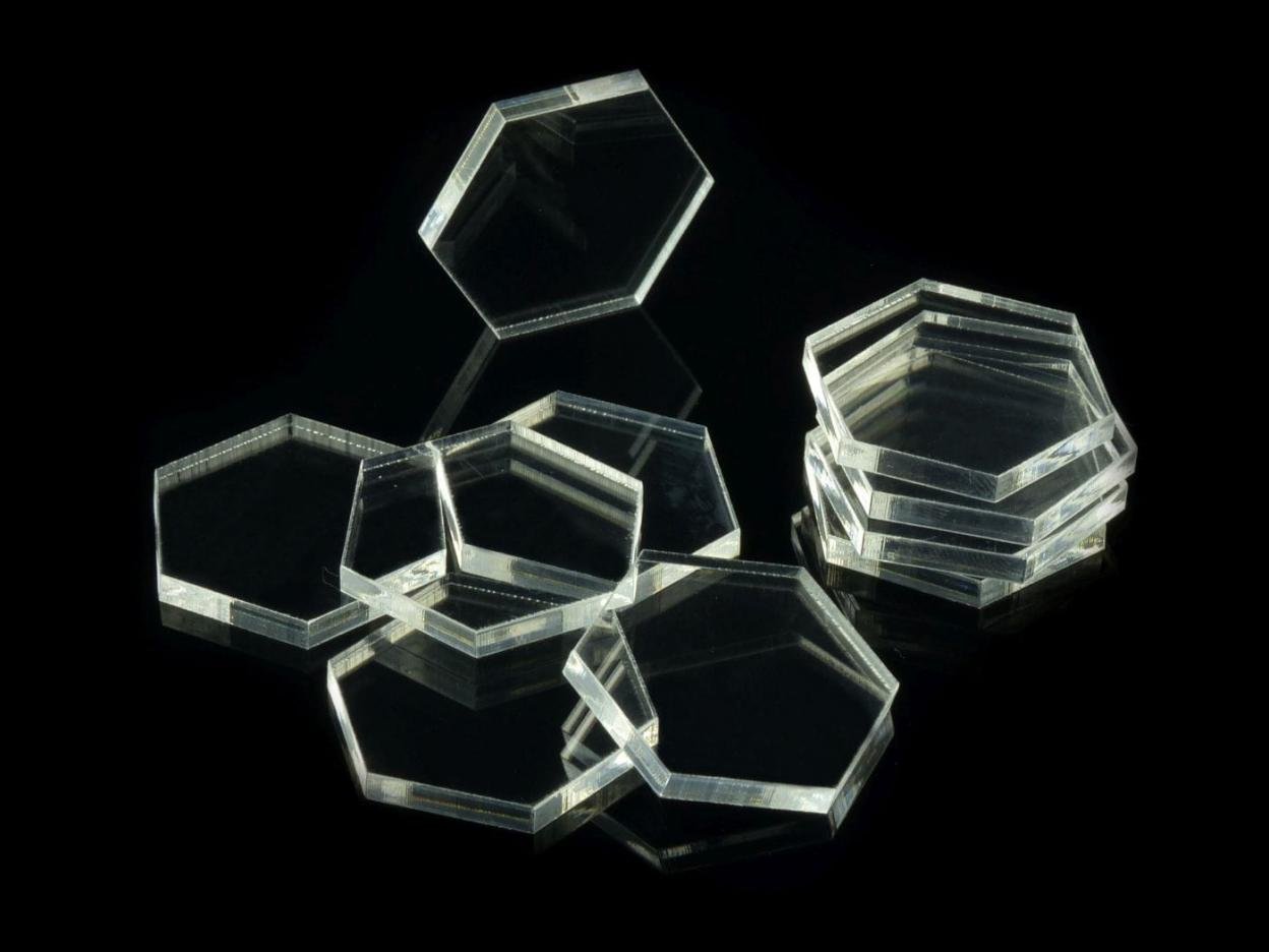 Akrylowe podstawki pod figurki w kształcie sześciokąta foremnego transparentne o krótszej przekątnej 25 mm i grubości 3 mm, 10 sztuk.