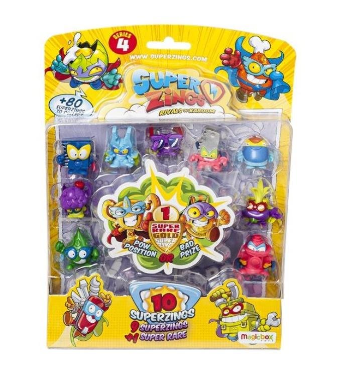SuperZings to przedmioty codziennego użytku przekształcone w SuperBohaterów i Złoczyńców. W 4. serii jest ponad 80 figurek SuperZings do zebrania! Ten spektakularny blister to najszybszy sposób na powiększenie własnej kolekcji. Zawiera aż 10 postaci, w tym jedną rzadką i trudną do zdobycia złotą...