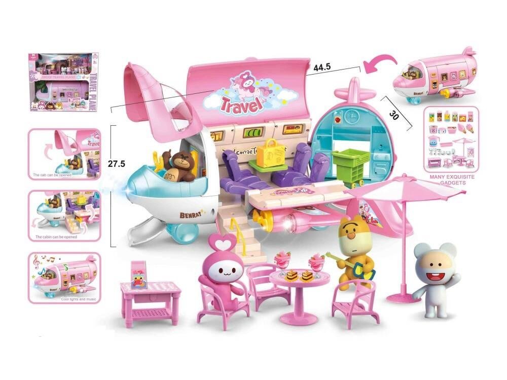 Misiowa rodzinka na samolocie. Dodatkowe akcesoria: 2 krzesła, 2 stoliki, parasol, zestaw artykułów spożywczych, zestaw naczyń. Produkt nie potrzebuje baterii. Zabawka przeznaczona dla dzieci powyżej 3 roku życia. prečítať celé