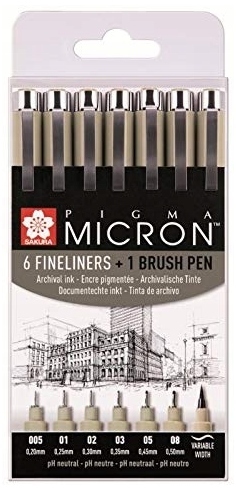 Cienkopisy Pigma Micron + Pigma Brush zestaw 6+1, Sakura
