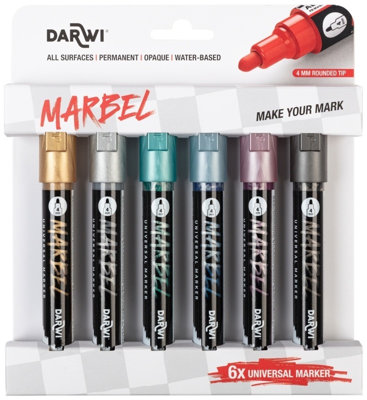 Zestaw 6 uniwersalnych markerów MARBEL.Kolory: Złoty, Srebrny, Metaliczny Zielony, Metaliczny Niebieski, Metaliczny Różowy, Metaliczny Czarny.Niezależnie od tego, czy chcesz naszkicować arcydzieło, nadać osobisty charakter codziennemu przedmiotowi, czy uwolnić swą kreatywność na różnych...